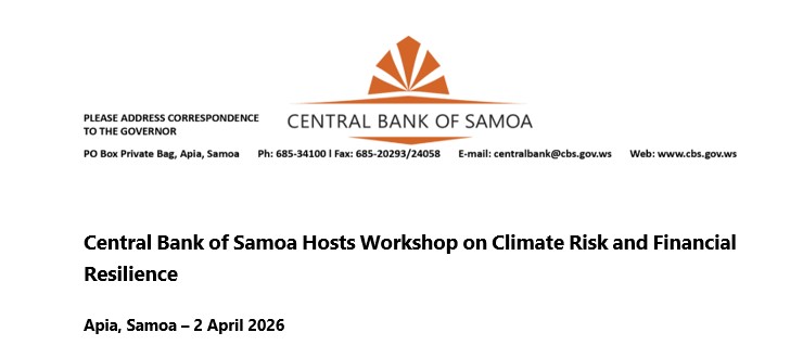 The Central Bank of Samoa (CBS), in collaboration with the United Nations Economic and Social Commission for Asia and the Pacific (UNESCAP), hosted a 1.5‑day national workshop on the 25th and 26th March 2026, to launch the report “ Strengthening Samoa’s Financial System to Enhance Resilience to Climate‑Related Risks. ” The workshop brought together regulators, financial institutions, and international experts.